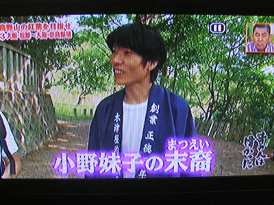 先月19日、MBS毎日放送の「ちちんぷいぷい」に出演いたしました。撮影は当家のご先祖小野妹子のお墓の前で行われました。小野妹子のことや当家の歴史などについて熱く語りました。撮影の最後に、私とタレントさん、アナウナサーの方の3人で、小野妹子のお墓にお参りしたことが、とても心に残りました。きっと、御先祖様も喜んで頂いたと思います。